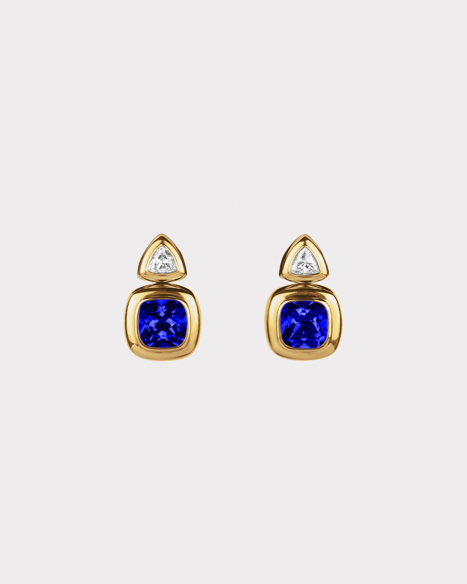 A fresh expression of the Puff Collection. The Puff Drop Earrings pair a luminous trillion-cut diamond stud with a 7mm cushion-cut gemstone, both framed in the collection’s signature sculptural bezel. The contrast of form and proportion creates a playful sense of movement. Elegant yet impactful, a design destined for statement moments.